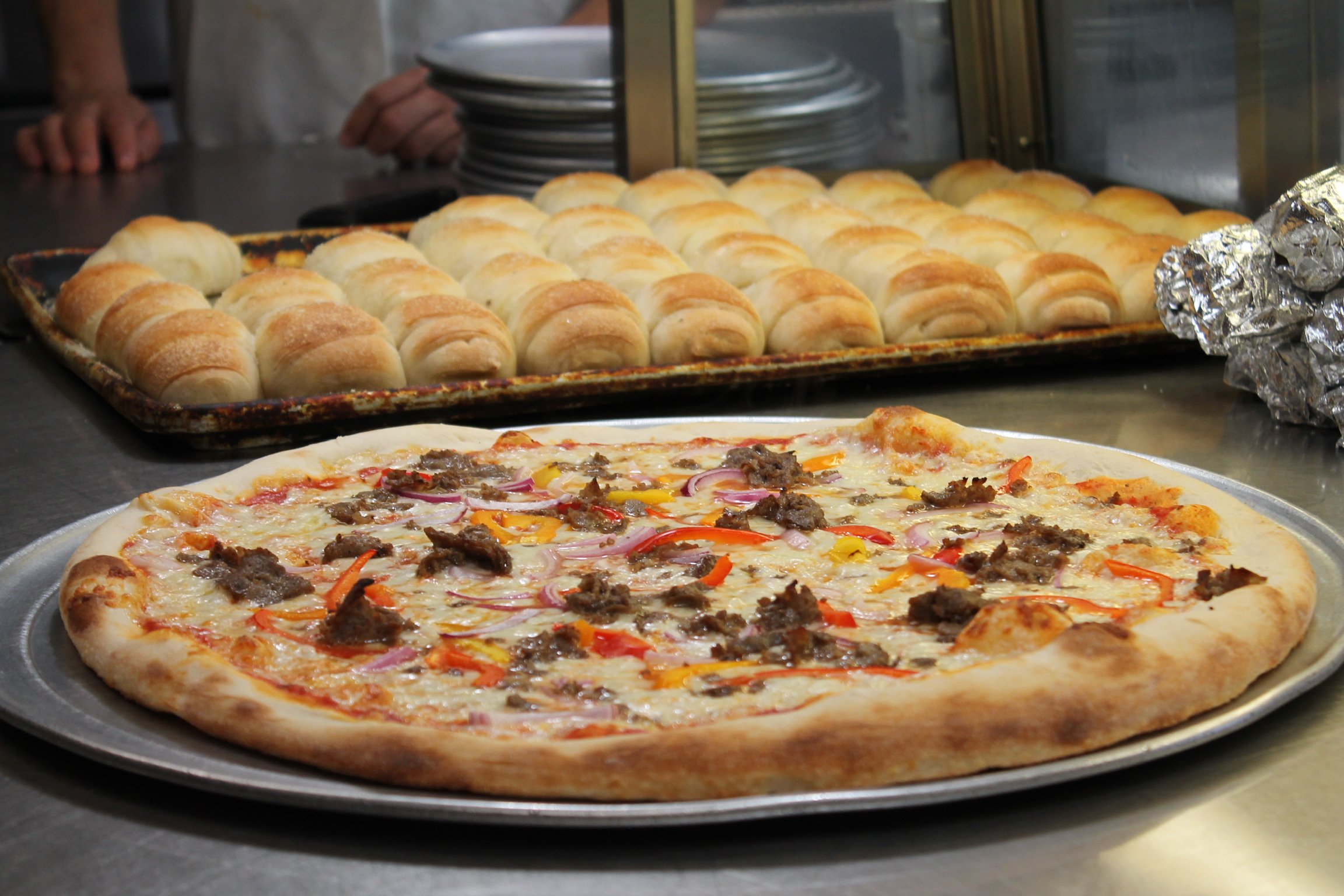 Our catering menu is priced per trays. There is a tray for 10 and a tray for 15. For custom orders or changes please call us. Once we gain a little more insight on the event, we can help you select the amount of food that is right for you. Our whole menu is available for catering. We also do special requests. If you are ordering pizza, our large 18 inch pie can feed up to four people. With an additional small salad it would make the perfect lunch.